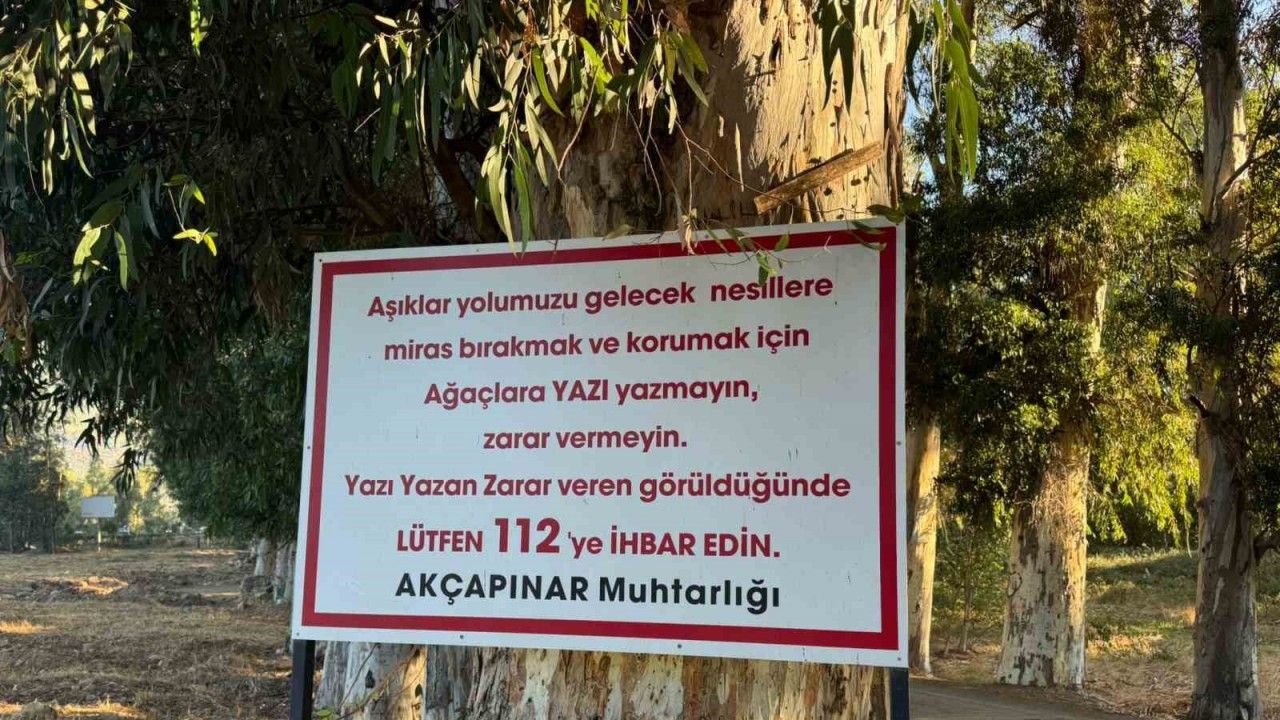 Muğla’nın Ula ilçesi Akçapınar Mahallesi’ndeki Ağaçlı Yol’daki (Aşıklar Yolu) ağaçlara yazı yazanlar muhtarlık tarafından asılan tabela ile uyarıldı.