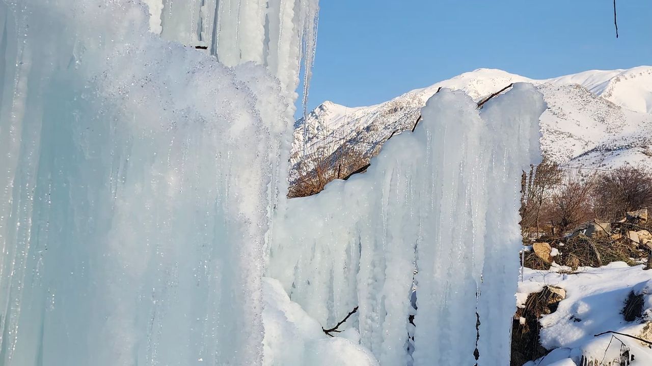 Elazığ'da son günlerde devam eden dondurucu soğuklar, ortaya ilginç görüntüler de çıkartıyor. Özellikle bina çatılarında oluşan ve tehlikeye davetiye çıkartan buz sarkıtları, bu sefer seyrine doyumsuz bir görsel şölen sundu. Elazığ merkeze bağlı İçme bölgesi Değirmenönü köyünde bir ağaçta dondurucu soğuklar nedeni ile buz sarkıtları meydana geldi. Travertenleri andıran sarkıtlar, vatandaşların da ilgi odağı oldu. Bölgeden geçerken görüntü çeken vatandaşlar, ''Burası İçme'ye bağlı Değirmenönü köyü. Aşırı soğuklardan dolayı buz sarkıtları oluşmuş. Yaklaşık 5 metre yüksekliğinde. Çok güzel bir görüntü ortaya çıkmış. Palulu dayının da dediği gibi anlatmaya gerek yok, görüyorsunuz'' dedi.