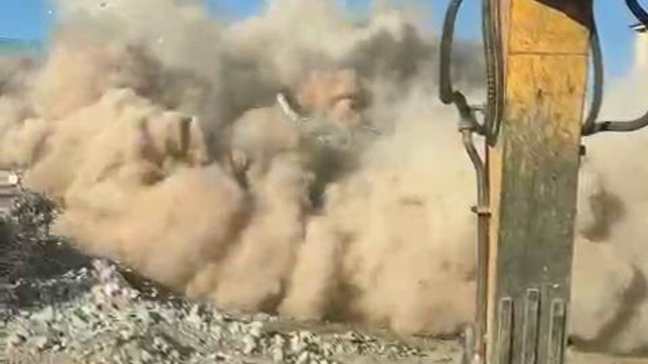 Kahramanmaraş merkezli depremlerde Elazığ’da ağır hasar alan bina, iş makinesinin dokunmasıyla yerle bir oldu.