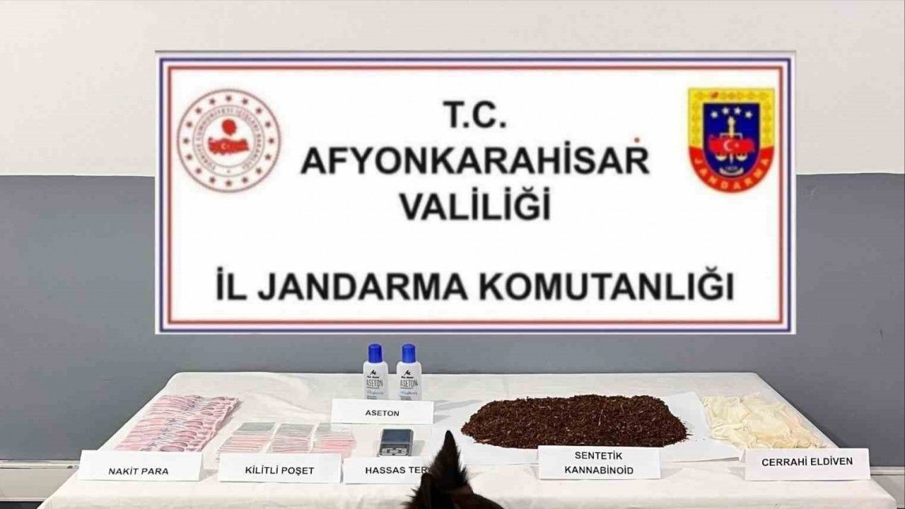 Edinilen bilgilere göre Afyonkarahisar İl Jandarma Komutanlığına bağlı ekipler aldığı bir ihbar üzerine Sinanpaşa ilçesinde bir adrese baskın düzenledi. Baskında yapılan aramada, plastik kova içerisinde aseton yedirilmiş uyuşturucu madde olduğu değerlendirilen yaklaşık 700 gram tütün malzemesi, 200 adet kilitli poşet, hassas terazi, eldiven, 2 adet aseton şişesi ve suçtan elde edildiği değerlendirilen 5 bin 650 TL para ele geçirildi.
