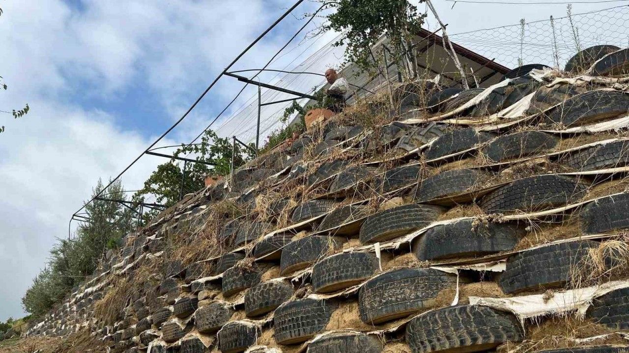 Manisa’nın Sarıgöl ilçesinde bir çiftçi, artık ömrünü tamamlamış olan yüzlerce araç lastiğinden bağ evinin önüne set duvar ördü. Tamamen lastik ve içleri topraktan oluşan geri dönüşümün en güzel örneklerinden birini sergileyen duvar, hem toprak kaymasını önledi hem de çiçek ve sebzelere yuva oldu.