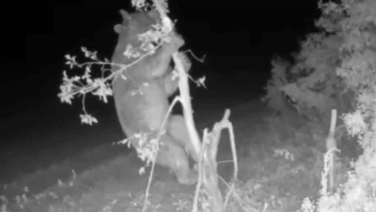 Kastamonu’nun Azdavay ilçesi Mehmetçelebi köyünde yiyecek arayan bir ayı, gece saatlerinde bir evin bahçesine girdi. Ayı bahçede gördüğü meyve ağacına tırmanarak meyveleri tek tek toplayarak yedi. Ayı meyveler için adeta ağacı talan etti. O anlar ise vatandaş tarafından bahçeye yerleştirilen güvenlik kamerasına yansıdı.