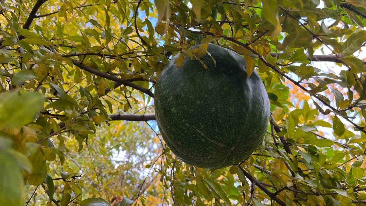 Denizli'nin Buldan ilçesi Turan Mahallesi'nde bahçeye ekilen kabak, nar ağacının tepesinde meyvelerini verdi. Bahar aylarında kabak çekirdeklerini toprağa gömdüğünü belirten Memnune Acıkara, 'Kabaklar dökecek diye çok uzun süre bekledim. Sulamasını yaptım, yabani otlarını temizledim. Her tarafa kol attı ancak bir türlü meyveye dönmedi. Ben artık kış geldi bu zamandan sonra meyve vermez diye düşünüyordum. Daha sonra iki nar ağacımın tepesinde kabakların olduğunu gördüm. Toprakta yetişmeyen kabaklar nar ağaçlarında yetişti. Bugüne kadar böyle bir şey hiç görmedim duymadım. Emeklerim çok şükür boşa gitmedi' dedi.