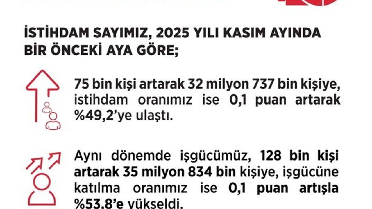 'İstihdam sayımız, 2025 yılı Kasım ayında bir önceki aya göre 75 bin kişi artarak 32 milyon 737 bin kişiye, istihdam oranımız ise 0,1 puan artarak yüzde 49,2'ye ulaştı. İşgücümüz, aynı dönemde 128 bin kişi artarak 35 milyon 834 bin kişiye, işgücüne katılma oranımız ise 0,1 puan artışla yüzde 53,8'e yükseldi. Etkin bir koordinasyon içerisinde uyguladığımız Orta Vadeli Program'ın sonuçlarını alıyoruz. Kasım ayında işsizlik oranı, yüzde 8,6 seviyesinde gerçekleşti. Böylelikle 31 aydır tekli hanelerde seyrini sürdürüyor. Gençlerde ise işsizlik oranı geçen yıla göre 0,4 puan azalarak yüzde 15,4 olarak gerçekleşti. Yenilikçi uygulamalarımız, emek ve insan odaklı politikalarımız ile ülkemizin güçlü geleceğini inşa edeceğiz.'
