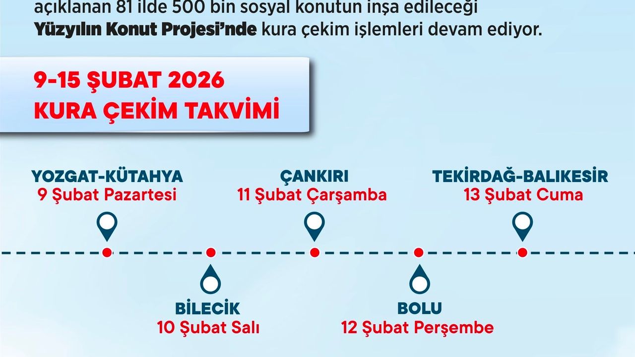 9-15 Şubat haftası takvimine göre; 9 Şubat Pazartesi Yozgat’ta 2 bin 858, Kütahya’da 3 bin 592, 10 Şubat Salı Bilecik’te bin 419, 11 Şubat Çarşamba Çankırı’da bin 753, 12 Şubat Perşembe Bolu’da bin 950, 13 Şubat Cuma Tekirdağ’da 6 bin 865, Balıkesir’de 7 bin 548 konutun daha hak sahipleri belirlenecek. Böylece 9-15 Şubat 2026 haftasında 7 ilde toplam 25 bin 985 konutun daha kurası çekilecek. 15 Şubat’ta kurası çekilen il sayısı 57’ye, hak sahibi belirlenen konut sayısı ise 203 bin 111’e yükselecek.