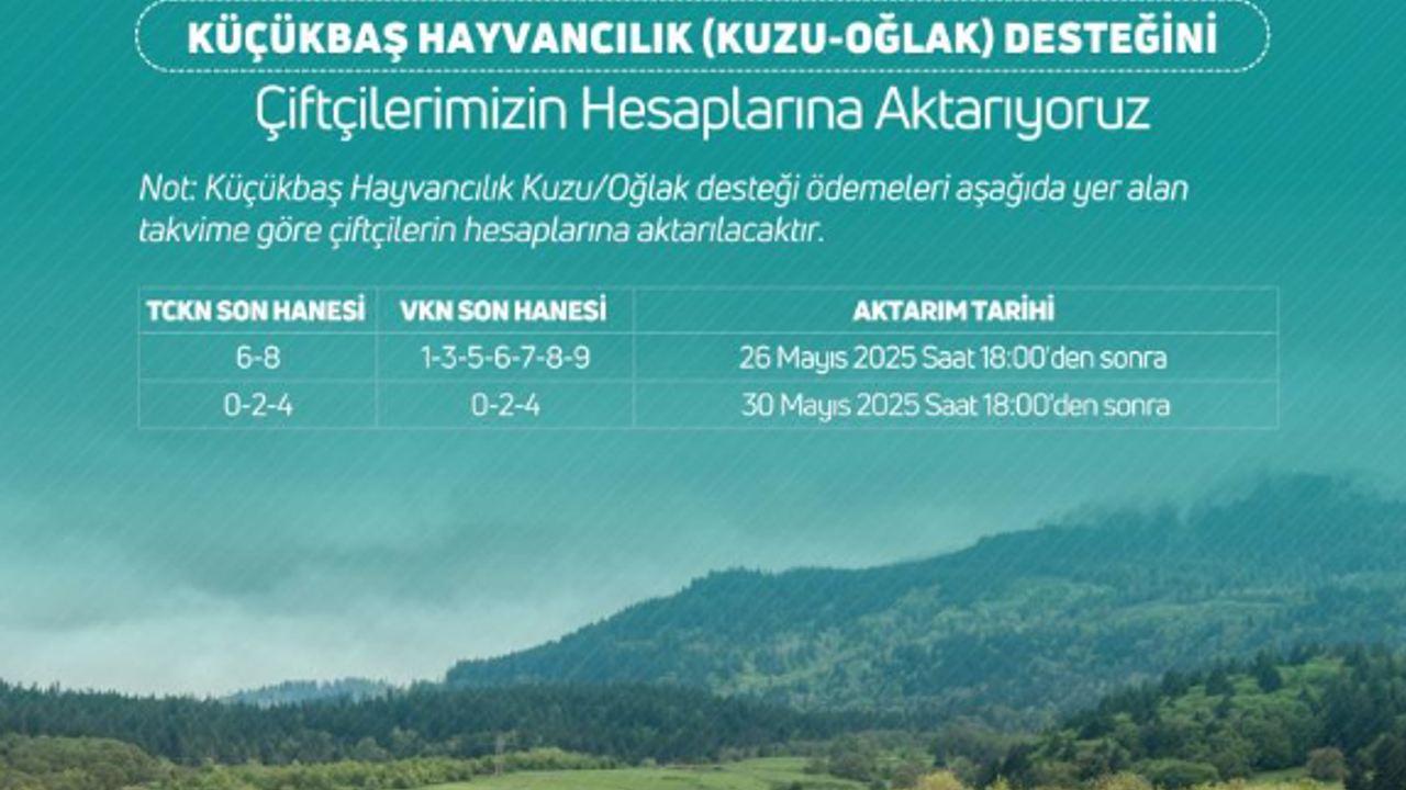 'Küçükbaş hayvancılık kuzu/oğlak desteği' ödemeleri çiftçilerin hesaplarına, kimlik kartlarının son hanesi 6-8, VKN son hanesi 1-3-5-6-7-8-9 olanların 26 Mayıs saat 18.00'den itibaren aktarılacağı, kimlik kartlarının son hanesi 0-2-4, VKN son hanesi 0-2-4 olanların ise 30 Mayıs saat 18.00'den itibaren aktarılacağı bildirildi.