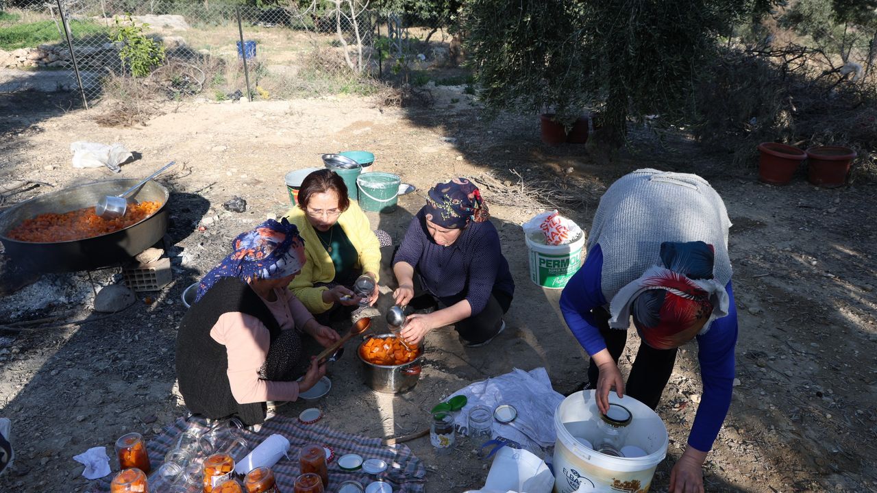 Adana'nın Kozan ilçesinde kadınlar, bahçede imece usulü kazanlarda kabak tatlısı yaptı.