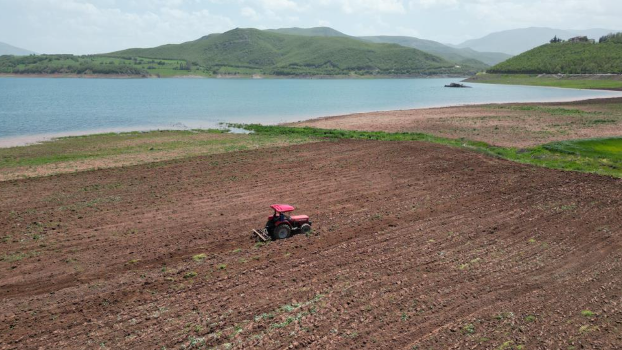 Almus Barajı'nda su seviyesi son yılların en düşük seviyesine gerilerken, geçilen sularla ortaya çıkan alanda tarıma başlanıldı.