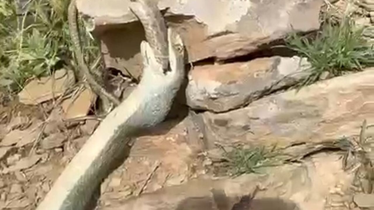 Hakkari'de bir doğasever, doğa yürüyüşü sırasında yaklaşık iki metrelik bir yılanın, başka bir yılanı yutmaya çalıştığı sırada ikisinin de telef olduğu anları görüntüledi.