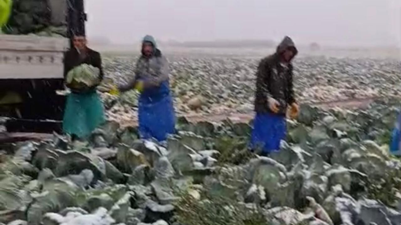 Sabahın erken saatlerinde tarlaya giren işçiler, yoğun kar yağışı ve soğuk hava altında mesailerini sürdürüyor. Lahanaların üzerini kaplayan karı temizleyip tek tek kesen işçiler, zorlayıcı hava koşullarına rağmen hasadı tamamlamak için çalışıyor.