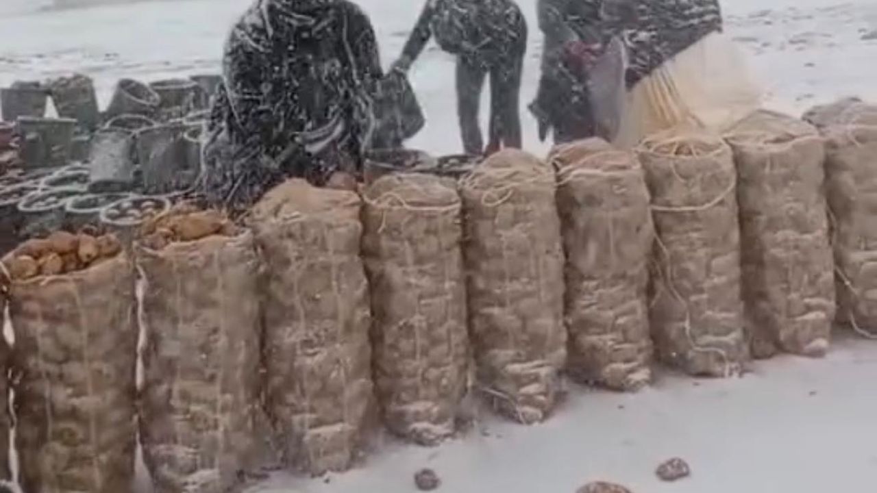 Yeşilgölcük’te patates işçileri, yoğun kar yağışı ve tipi etkili olmasına rağmen hasat çalışmalarını sürdürmeye devam ediyor.