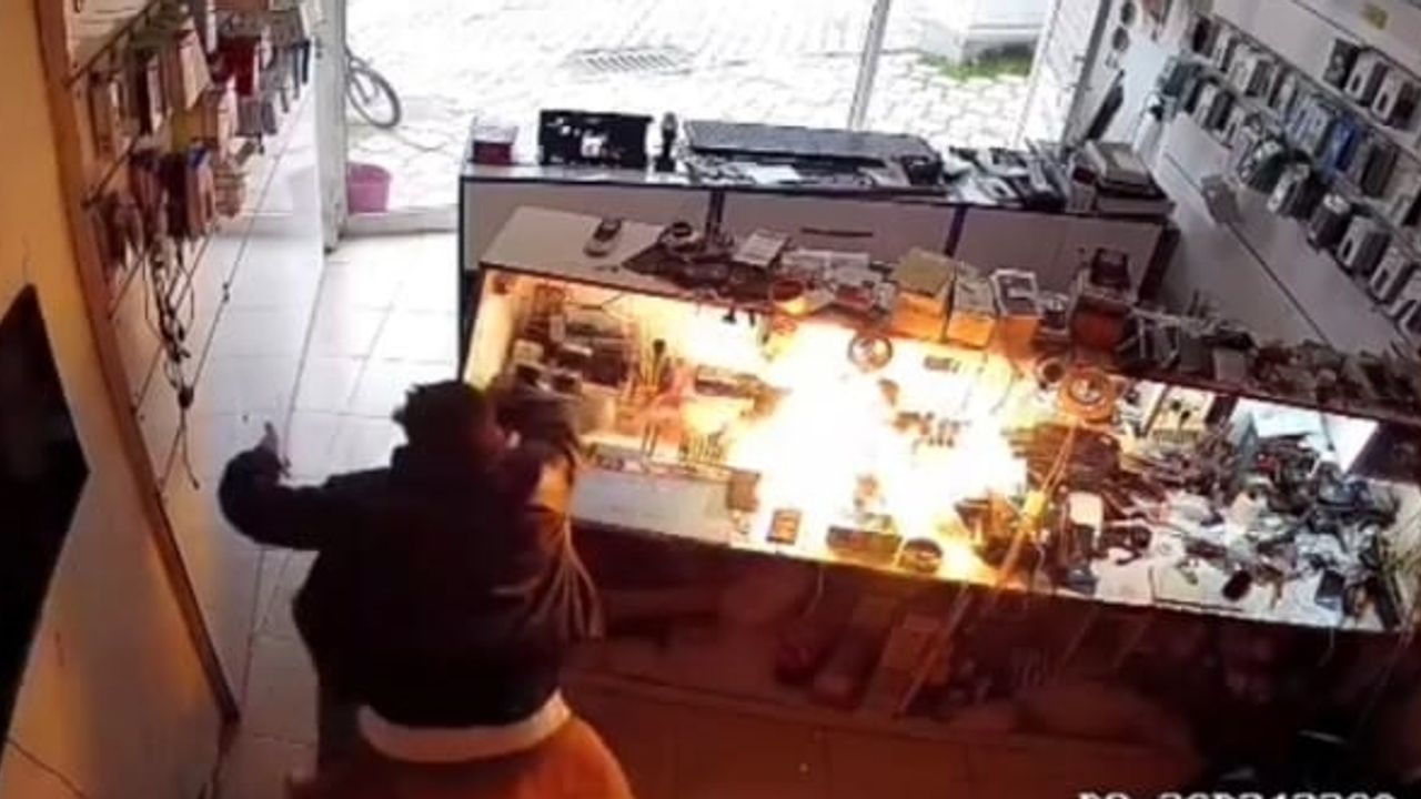 Giresun'un Piraziz ilçesinde bataryası şişen bir cep telefonu tamircide işlem sırasında patlayarak alev alırken, o anlar iş yerinin güvenlik kamerasına yansıdı.