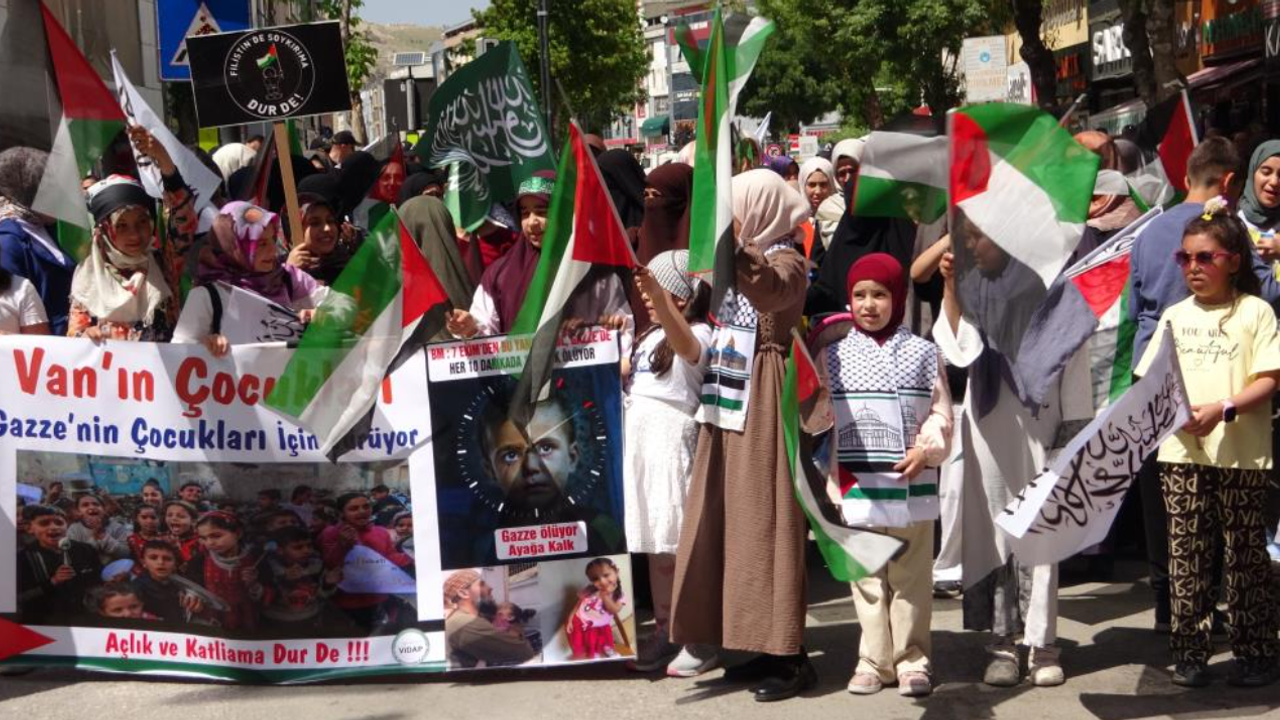 Van İslami Dayanışma Platformu (VİDAP) tarafından düzenlenen programda çocuklar, Gazze’deki yaşıtlarına destek olmak amacıyla yürüyüş gerçekleştirdi.