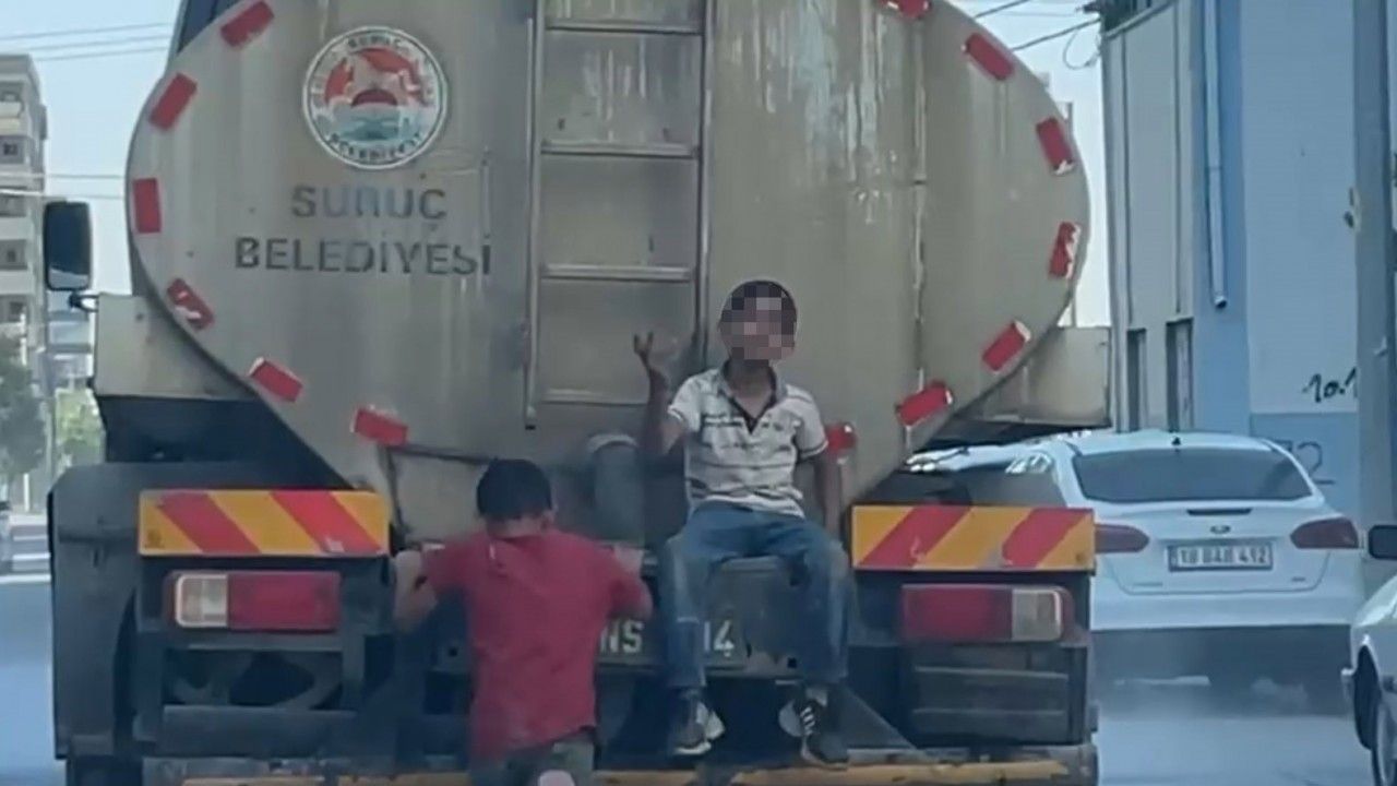 Şanlıurfa’nın Suruç ilçesinde çocukların trafikte seyir halinde olan araçların arkasına tutunarak yolculuk yapmaya çalışması yürekleri ağızlara getirdi. Suruç Belediyesinin yol sulama tankerine tutunan çocuklar, arka kısımda yer alan demire oturarak yolculuk yapmaya çalıştı. Tankerin arkasından seyreden bir araçtan çekilen görüntüde, çocukların tehlikeye aldırış etmedikleri gözlendi. Cep telefonuyla görüntülendiklerini fark eden çocuklar, atlayarak uzaklaştı.