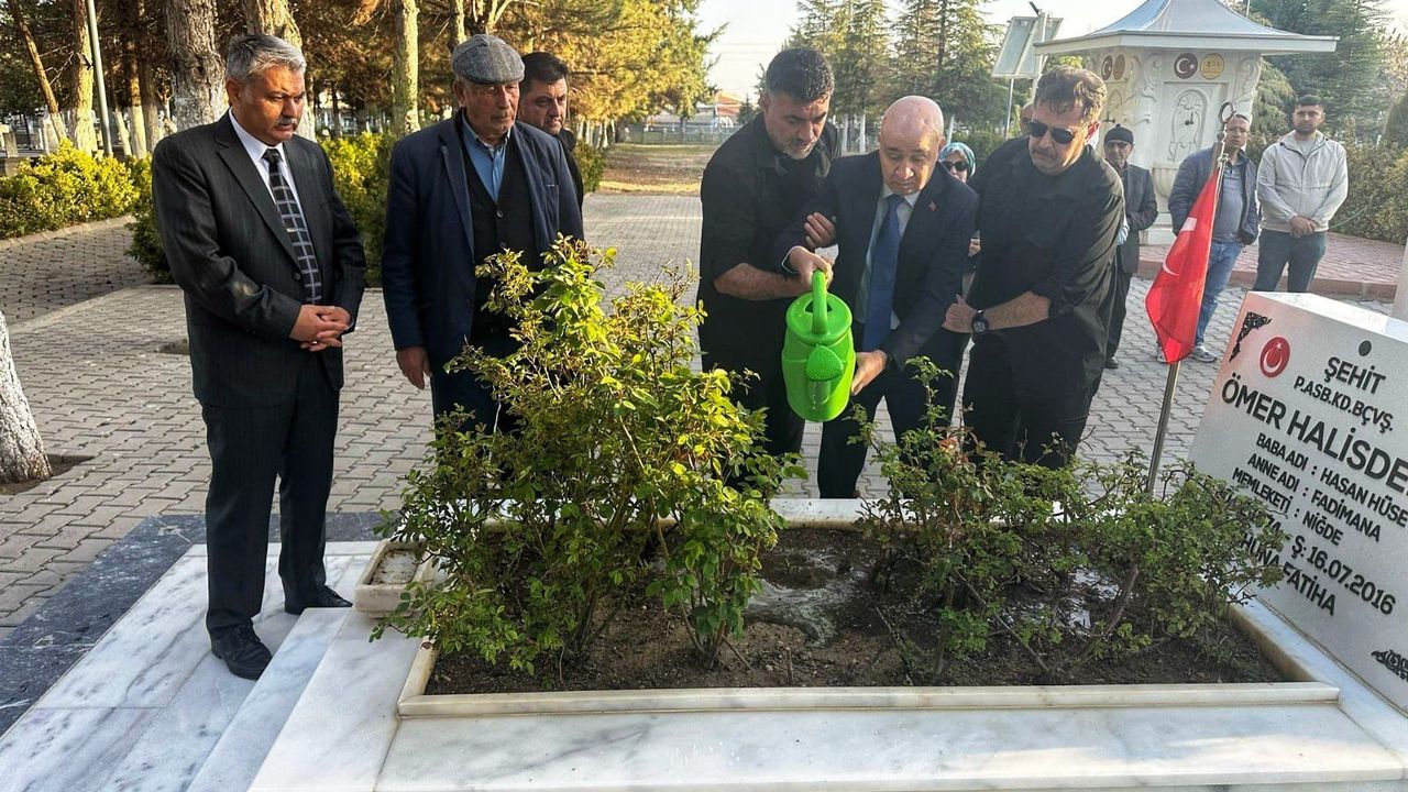 Niğde Valisi Cahit Çelik, Cumhurbaşkanı Başdanışmanı ve 15 Temmuz Gazisi Turgut Aslan, Polis Başmüfettişi Uğur Çelik ve Niğde İl Emniyet Müdürü Yılmaz Delen, 15 Temmuz Şehidi Ömer Halisdemir’in Bor ilçesindeki kabrini ziyaret etti.