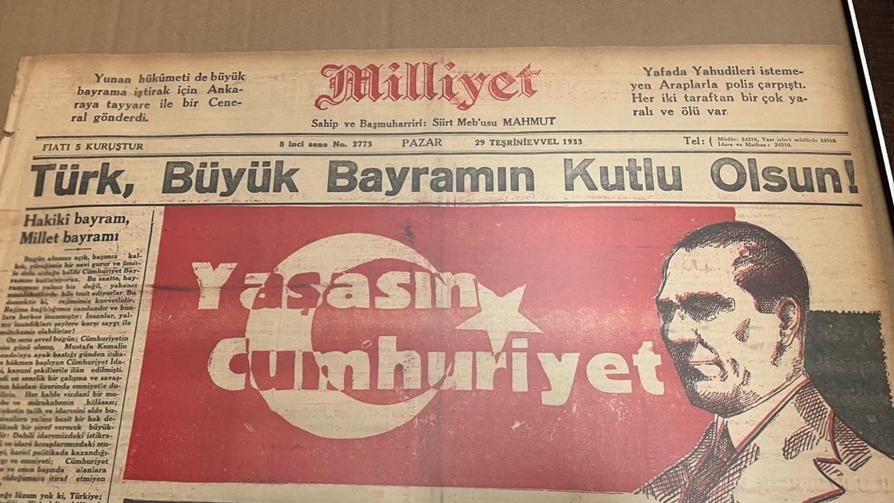 Karacan’ın elinde, eski dönemlere ait orijinal gazeteler bulunuyor. Bunlar arasında 23 Nisan 1930 ve 29 Ekim 1933 tarihli gazeteler de yer alıyor. Ancak Karacan, en çok 29 Ekim 1923 tarihli gazeteyi bulmak istediğini belirterek “Cumhuriyet’in ilan edildiği güne ait gazeteye ulaşmak istiyordum ama gerçekten çok zor. Uzun araştırmalarım sonucu 1930 ve 1933 yıllarına ait baskılara ulaşabildim,”