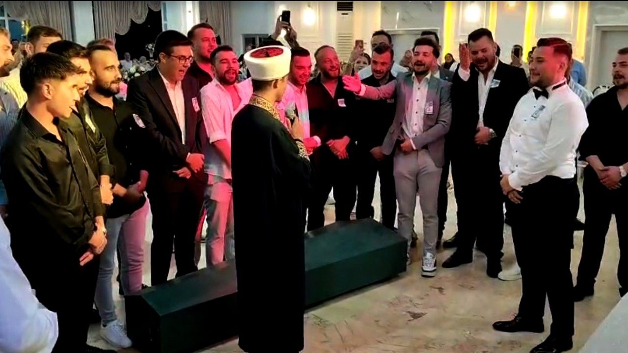 Bilecik’te dünya evine giren arkadaşları için ilginç bir şaka planlayan gençler, tabutla, ’Acı kaybımız’ yazan çelenkle düğün salonuna gelip damat için helallik istediler, ruhuna Fatiha okudular.