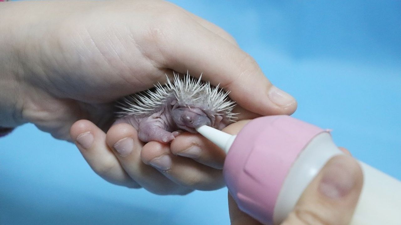 Doğada bulunan 3 yavru kirpi biberonla besleniyor