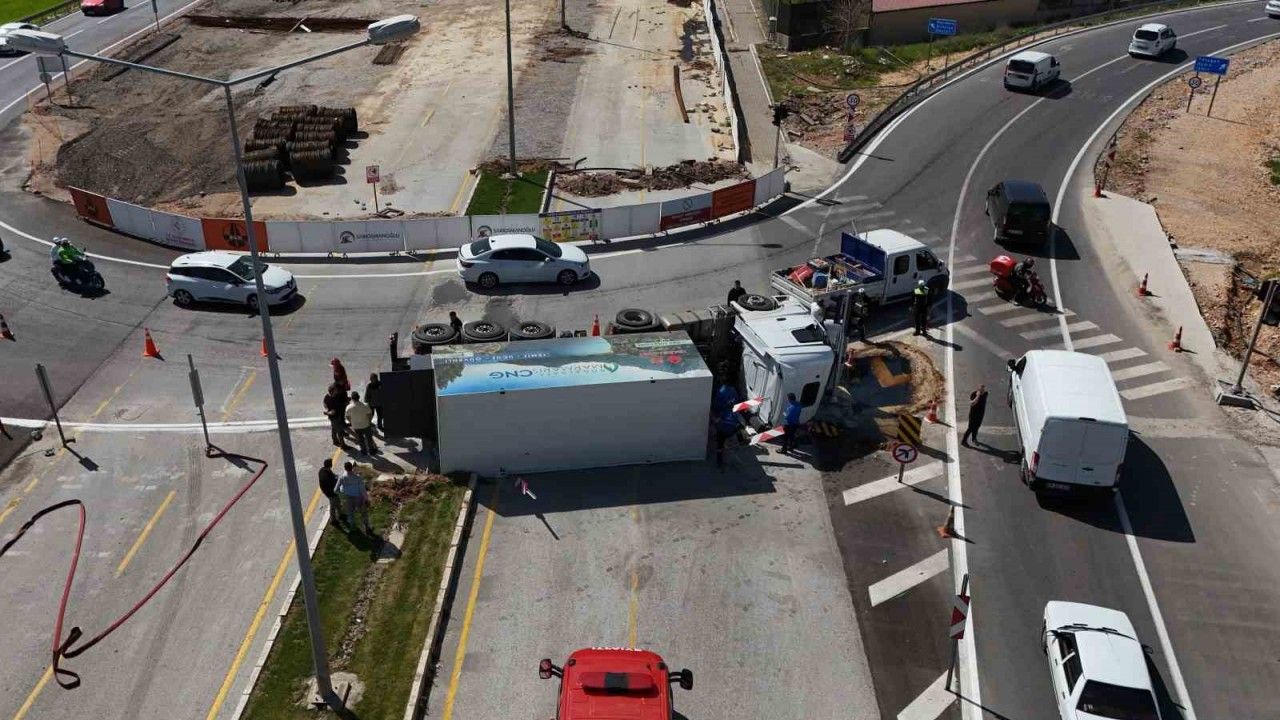 Muğla’nın Menteşe ilçesinde virajı alamayan doğalgaz yüklü Mercedes tır devrilirken, kazada araç sürücüsü hafif şekilde yaralandı.