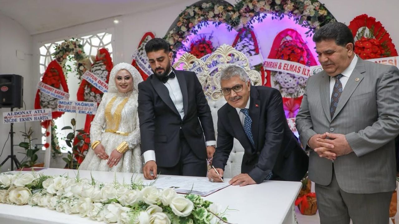 Niğde Valisi Cahit Çelik çiftlere birlik ve beraberlik içinde geçen bir ömrün temennisinde bulundu.