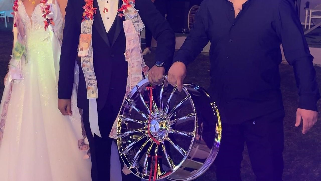 İzmir’de bir düğün merasiminde gelin ve damada araba jantı takı olarak takıldı.