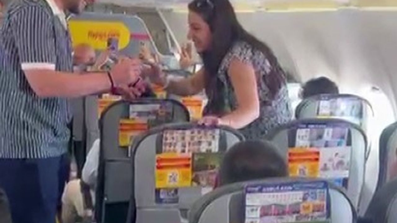 Teklifine ’evet’ yanıtını alan Ahmet Kaymaklı sevinçle kız arkadaşına sarılırken, uçaktaki yolcular da çiftin mutluluklarına ortak oldular.