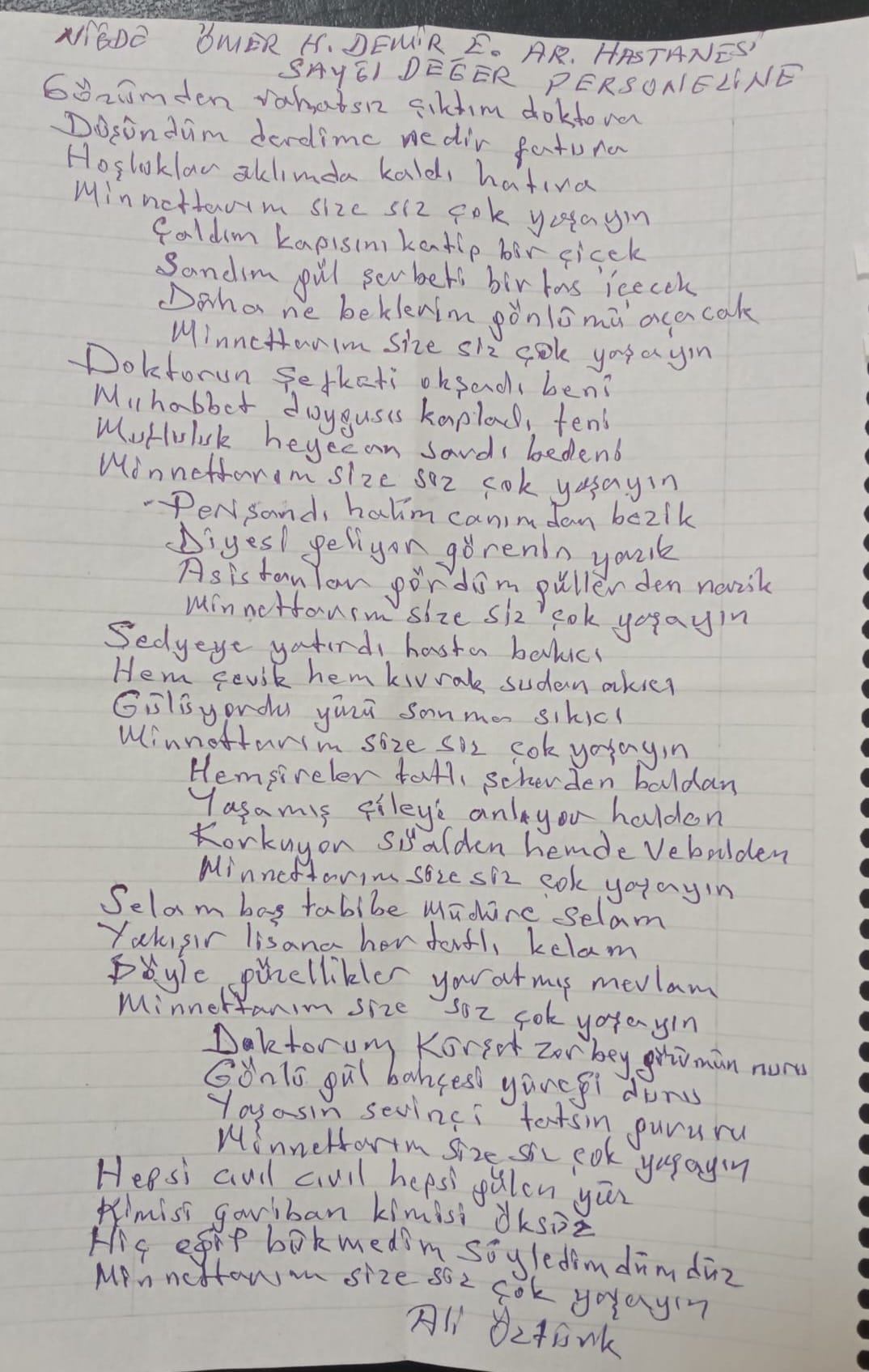 Niğde Ömer Halisdemir Eğitim ve Araştırma Hastanesi’nde anlamlı bir ziyaret gerçekleşti. 75 yaşındaki emekli imam Ali Öztürk, sağlık çalışanlarına duyduğu minnettarlığı dile getirmek için kaleme aldığı şiiri, Başhekim Dr. Öğr. Üyesi Mustafa Doğan’a takdim etti.