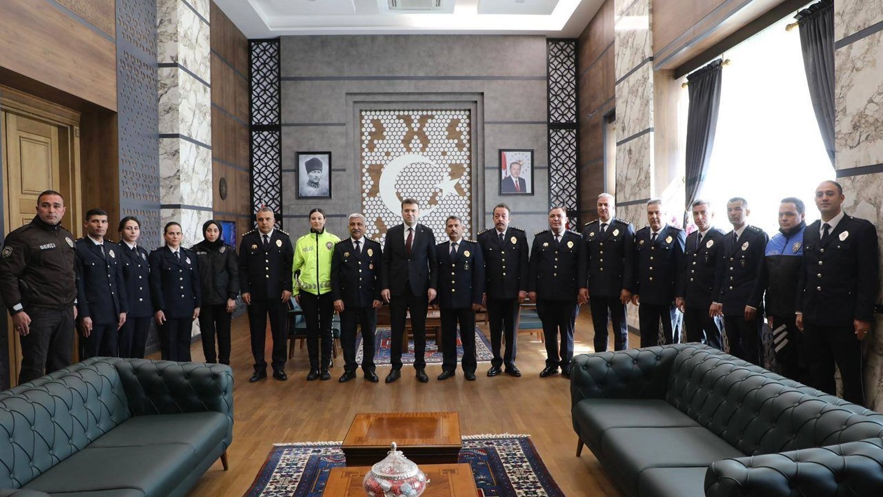 Polis Haftası kapsamında İl Emniyet Müdürü Erdinç Yüceer, Niğde Polis Meslek Eğitim Merkezi Müdürü Mehmet Kemal Arısoy ve beraberindeki emniyet personeli, Vali Nedim Akmeşe’yi makamında ziyaret etti. Vali Akmeşe, Türk Polis Teşkilatı’nın 10 Nisan Polis Günü ve Polis Haftası’nı kutlayarak görevlerini özveriyle yerine getiren emniyet mensuplarına başarı diledi. Ziyaretten duyduğu memnuniyeti dile getiren Vali Akmeşe, misafirlerine teşekkür etti.