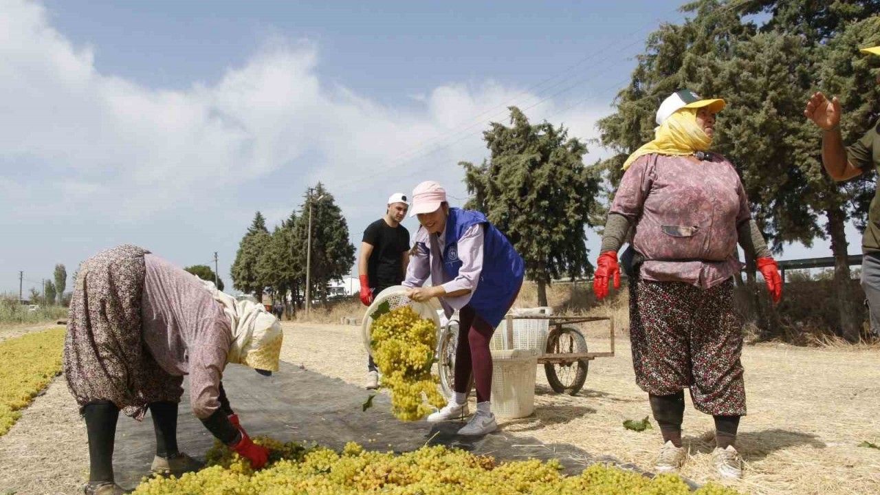 Gönüllü gençler, Manisa’nın dünyaca ünlü sultaniye çekirdeksiz üzümlerini özenle kesip sepetlere doldurdu. Üzüm bağında çalışan kadınlardan üretimin aşamalarını öğrenen gençler, üzüm sepetlerini traktörlerle sergiye taşıdı. Çiftçilere yardımcı olan gençler, üzümlerin bandırma işleminin ardından kurutulmak üzere sergiye yerleştirdi.
