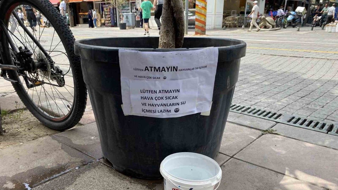 Eskişehir’de hayvansever bir vatandaşı su koyduğu kabın sürekli çöpe atılması nedeniyle bir saksının üzerine astığı, "Lütfen atmayın. Hayvanlar su içiyor ve hava çok sıcak. Hayvanların su içmesi" yazılı kibar uyarısı dikkat çekti.