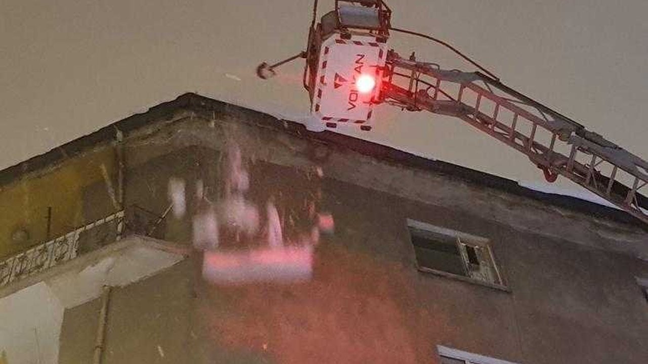 İtfaiye çatıdaki kar kütlelerini temizliyor