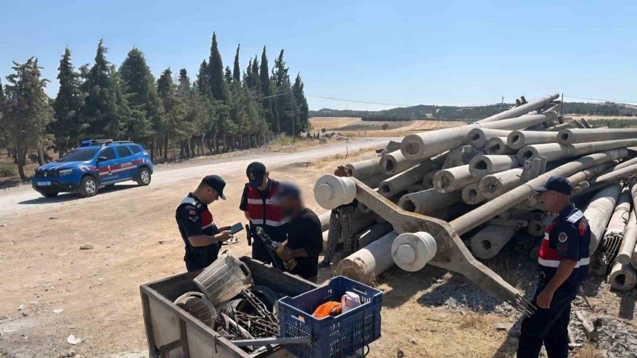 Olay, Manisa’nın Saruhanlı ilçesine bağlı Develi Mahallesi’nde meydana geldi. Jandarma ekipleri devriye görevi yürüttükleri sırada bakıma alınan yaklaşık 50 adet elektrik direğinin üzerinde bulunan demirler ve malzemelerin, M.U. (31) ve Y.U. (29) isimli şahıslar tarafından çalındığını fark etti. Şüphelilere suçüstü yapan ekipler olayda kullanılan 1 adet sprial makinesi, 1 adet demir keskisi ve 1 adet motosiklete el koydu. Gözaltına alınan şüpheliler hakkında adli işlem başlatıldı.