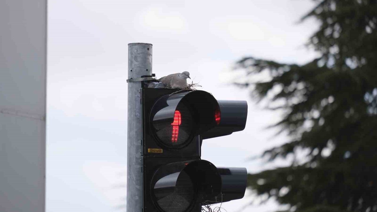 Karaman'ın en işlek kavşağındaki trafik lambasının üzerine yuva yapan kumru, sürücüler başta olmak üzere görenleri şaşırtıyor.