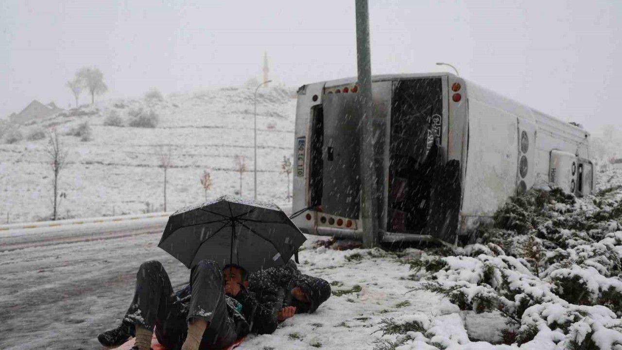Nevşehir’de işçileri taşıyan servisin takla atması sonucu 14 kişi yaralanırken, yaralılardan biri sağlık ekiplerinin gelmesini şemsiye ile uzanarak bekledi.