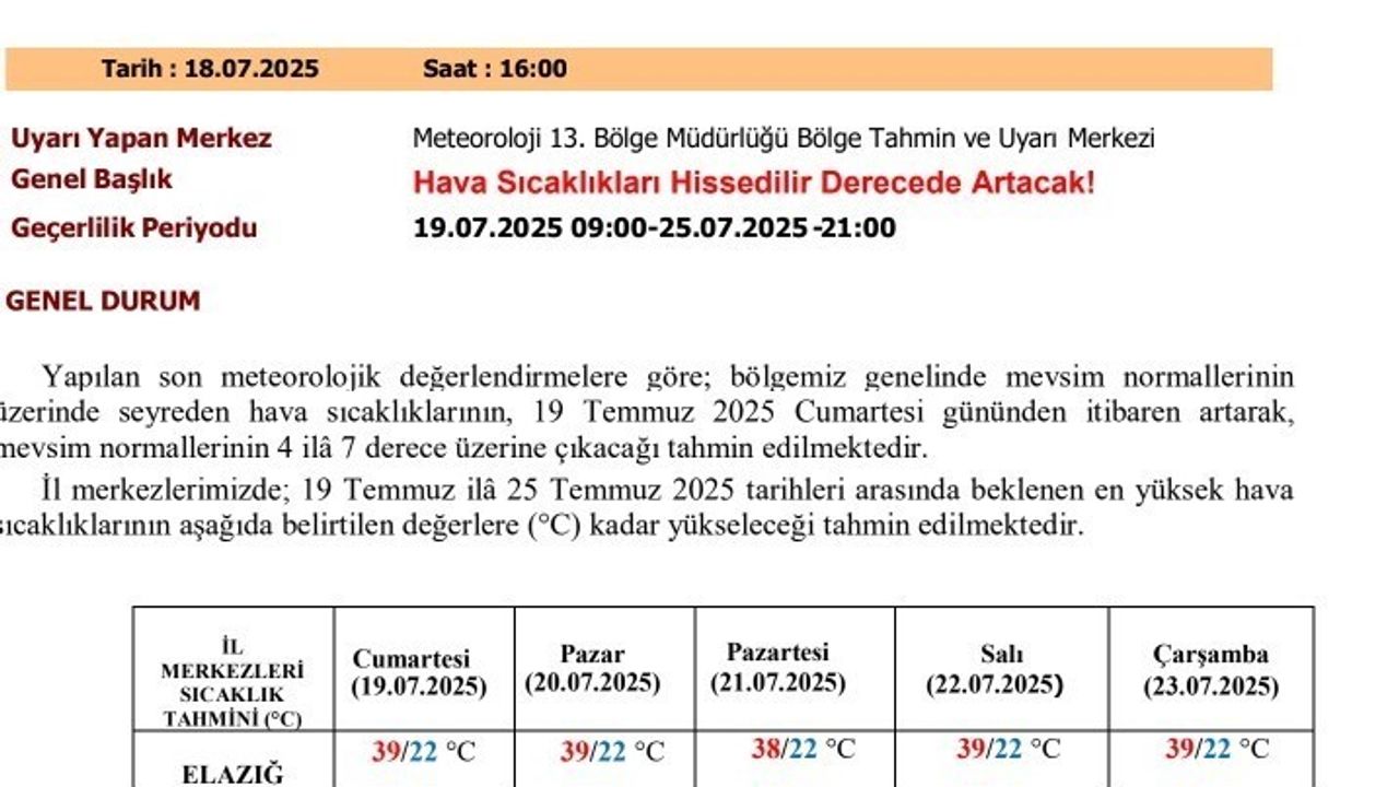 Meteoroloji 13. Bölge Müdürlüğü’nden yapılan açıklamada, "Yapılan son meteorolojik değerlendirmelere göre, bölgemiz genelinde mevsim normallerinin üzerinde seyreden hava sıcaklıklarının, 19 Temmuz 2025 Cumartesi gününden itibaren artarak, mevsim normallerinin 4 ila 7 derece üzerine çıkacağı tahmin edilmektedir. Sıcaklıklardaki yükselişe bağlı olarak güneş ışınlarının dik geldiği 11 ile 16 saatleri arasında başta yaşlılar, çocuklar ve kronik rahatsızlığı olan vatandaşlarımızın sıcak çarpmasına karşı dikkatli ve tedbirli olmaları önem arz etmektedir" denildi.