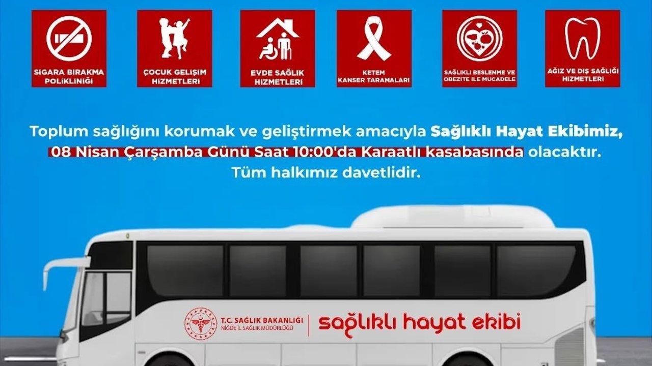 Niğde’de birinci basamak sağlık hizmetleri kapsamında yürütülen mobil sağlık çalışmaları, 8 Nisan Çarşamba günü saat 10.00’da Karaatlı kasabasında gerçekleştirilecek.