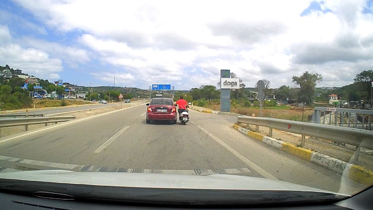 Olay, İstanbul - Şile Yolu üzerinde meydana geldi. Edinilen bilgiye göre, plakası belirlenemeyen motosiklet sürücüsü, seyir halindeki bir otomobilin açık camından kapıya tutunarak ilerledi. Kasksız olduğu görülen sürücü, hem kendi canını hem de trafikteki diğer sürücüleri riske attı.