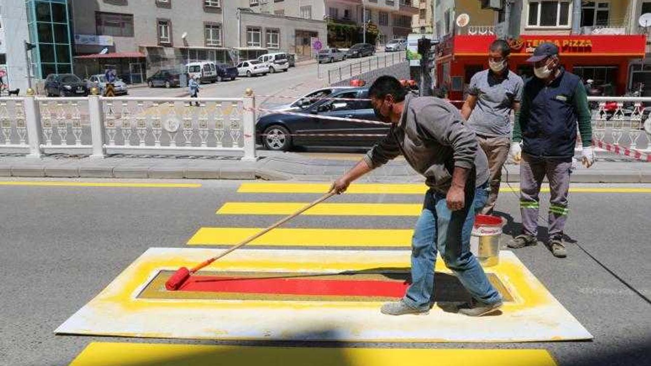 Belediye ekipleri kapanma öncesi dönemde araç ve yaya trafiğinin yoğun olarak aktığı cadde ve sokaklarda yol çizgilerini boyayarak, yaya geçidi çizgilerini yeniliyorlar.