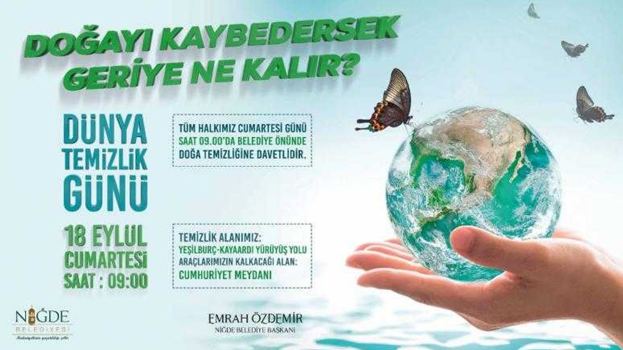 Niğde Belediyesi dünya temizlik günü sebebiyle bir temizlik seferberliği başlatıyor. Bu seferberlik kapsamında18 Eylül Cumartesi günü saat 09.00'da Belediyeönünde toplanılacak ve burada Belediye Başkanı Emrah Özdemir tarafından konuyla ilgili bir farkındalık oluşturmak amacıyla belediyenin önü süpürülecek. Aynı şekilde çevredeki esnafta kendi dükkanlarının önünü süpürerek kampanyaya destek verec