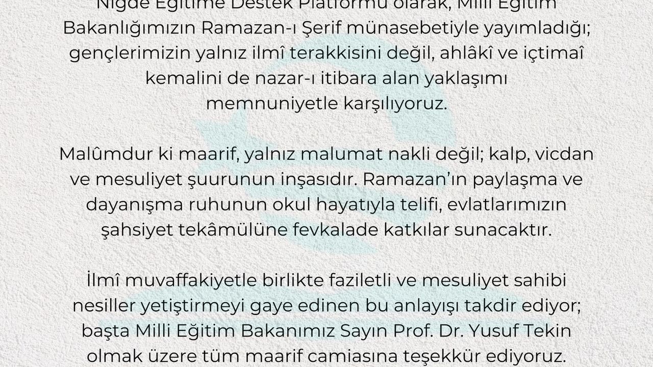 Niğde Eğitime Destek Platformu, Milli Eğitim Bakanlığının Ramazan-ı Şerif dolayısıyla yayımladığı ve gençlerin yalnızca akademik başarısını değil, ahlaki ve toplumsal gelişimini de esas alan yaklaşımını memnuniyetle karşıladıklarını bildirdi.