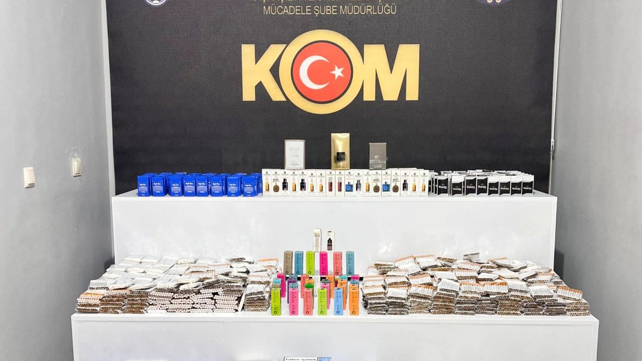 Şüphelilerin iş yeri ve araçlarında yapılan aramalarda 30 bin adet tütünle doldurulmuş makaron, 6 bin adet boş makaron, 86 adet gümrük kaçağı emtia niteliğinde parfüm, 61 adet elektronik sigara likiti, 1 adet tabanca, 1 adet tabanca şarjörü ile 9 adet tabanca fişeği ele geçirildi.