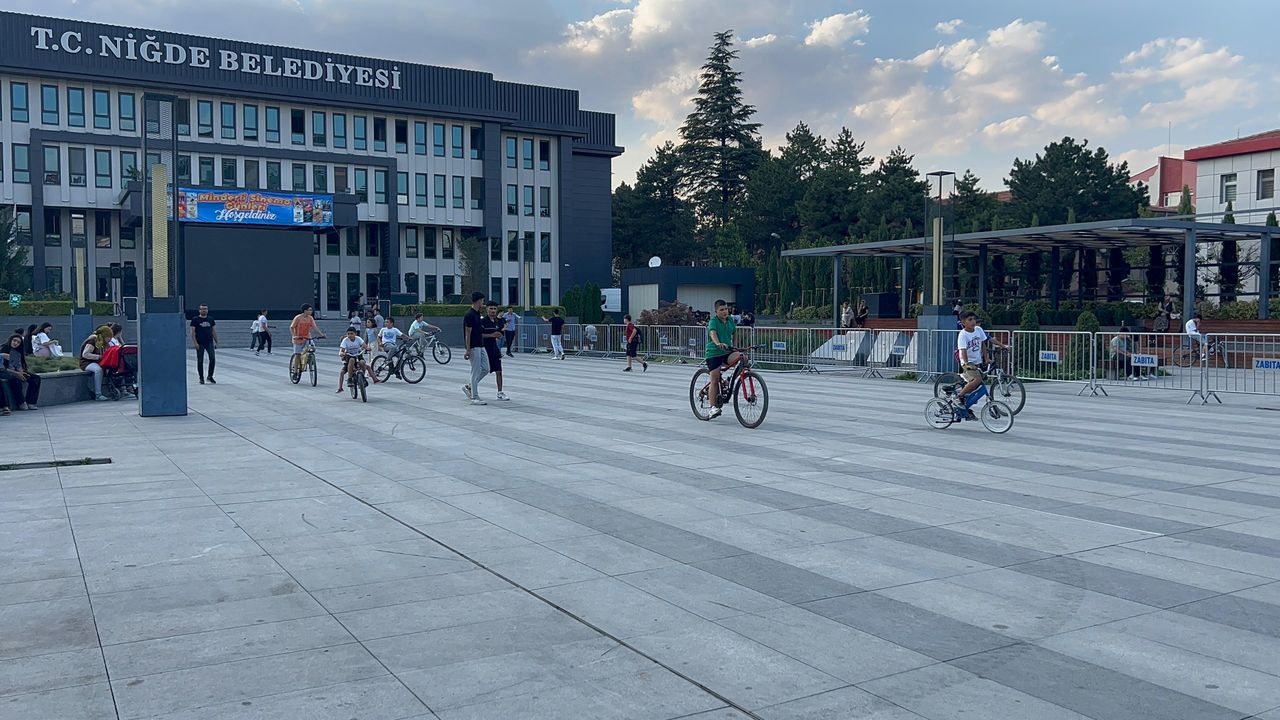 Niğde’de Şehit Ömer Halisdemir Meydanı’nda düzenlenen minderli açık hava sinema etkinliği öncesinde çocuklar keyifli anlar yaşadı.