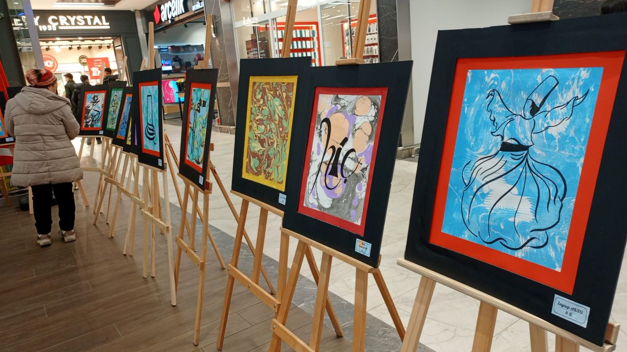 Sergide, öğrencilerin geleneksel Türk sanatlarından ebru alanında hazırladığı eserler ziyaretçilerin beğenisine sunuldu. “Aşkın İzinde Şeb-i Arûs” programı kapsamında gerçekleştirilen ebru sergisi, geleneksel sanatların yaşatılmasına katkı sunuyor.