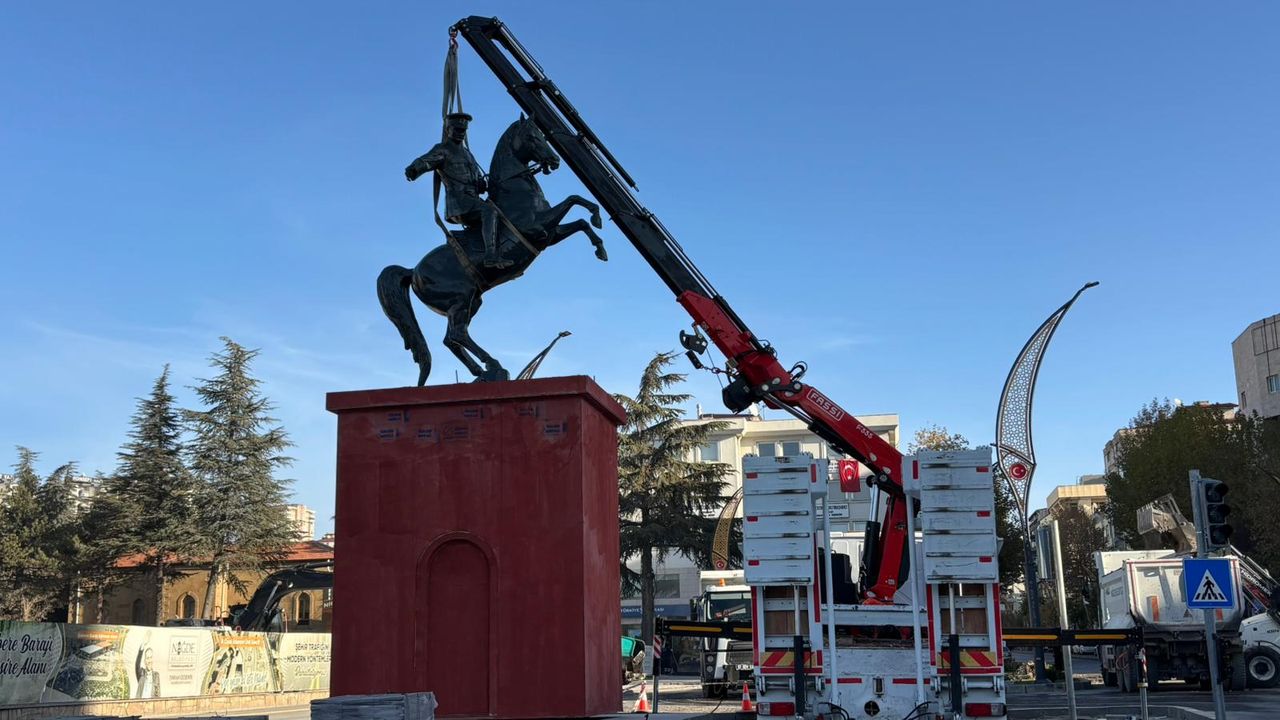 Vinç yardımıyla taşınan Atatürk heykeli, meydandaki yeni platformuna dikkatli bir şekilde konumlandırıldı.