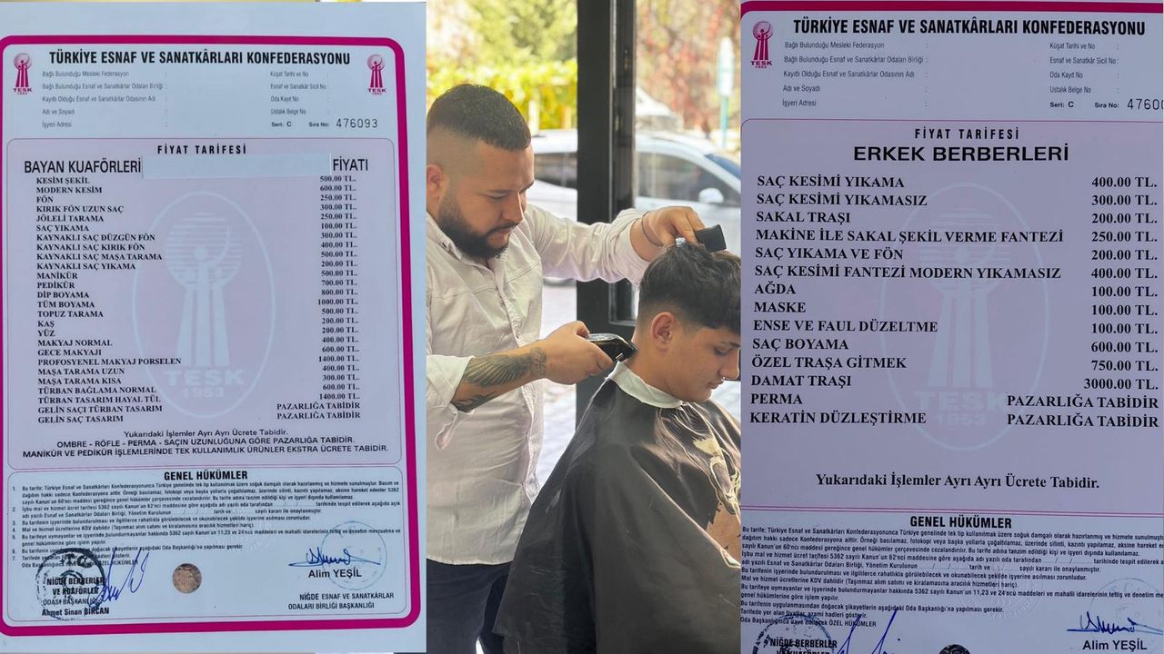 Güncellenen tarifeye göre erkek berberlerinde saç kesimi ve yıkama 400 TL, yıkamasız saç kesimi 300 TL, sakal tıraşı 200 TL, makine ile sakal şekillendirme 250 TL oldu. Saç yıkama ve fön 200 TL, fantezi ve modern saç kesimi yıkamasız 400 TL’den uygulanacak. Ağda, maske ile ense ve faul düzeltme işlemleri 100 TL olarak belirlendi. Saç boyama 600 TL, özel tıraş 750 TL, damat tıraşı ise 3 bin TL olarak tarifeye yansıdı. Perma ve keratin düzleştirme işlemlerinin pazarlığa tabi olacağı belirtildi.