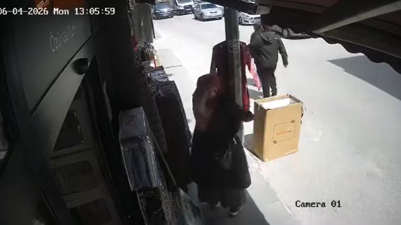 Edinilen bilgiye göre, bir kadın telefonla konuşuyormuş gibi yaparak dükkânın önüne geldi. Bir süre çevreyi kontrol eden şüpheli, iş yerinin önünde asılı bulunan kıyafeti bulunduğu yerden alarak kolunun altına sakladı.