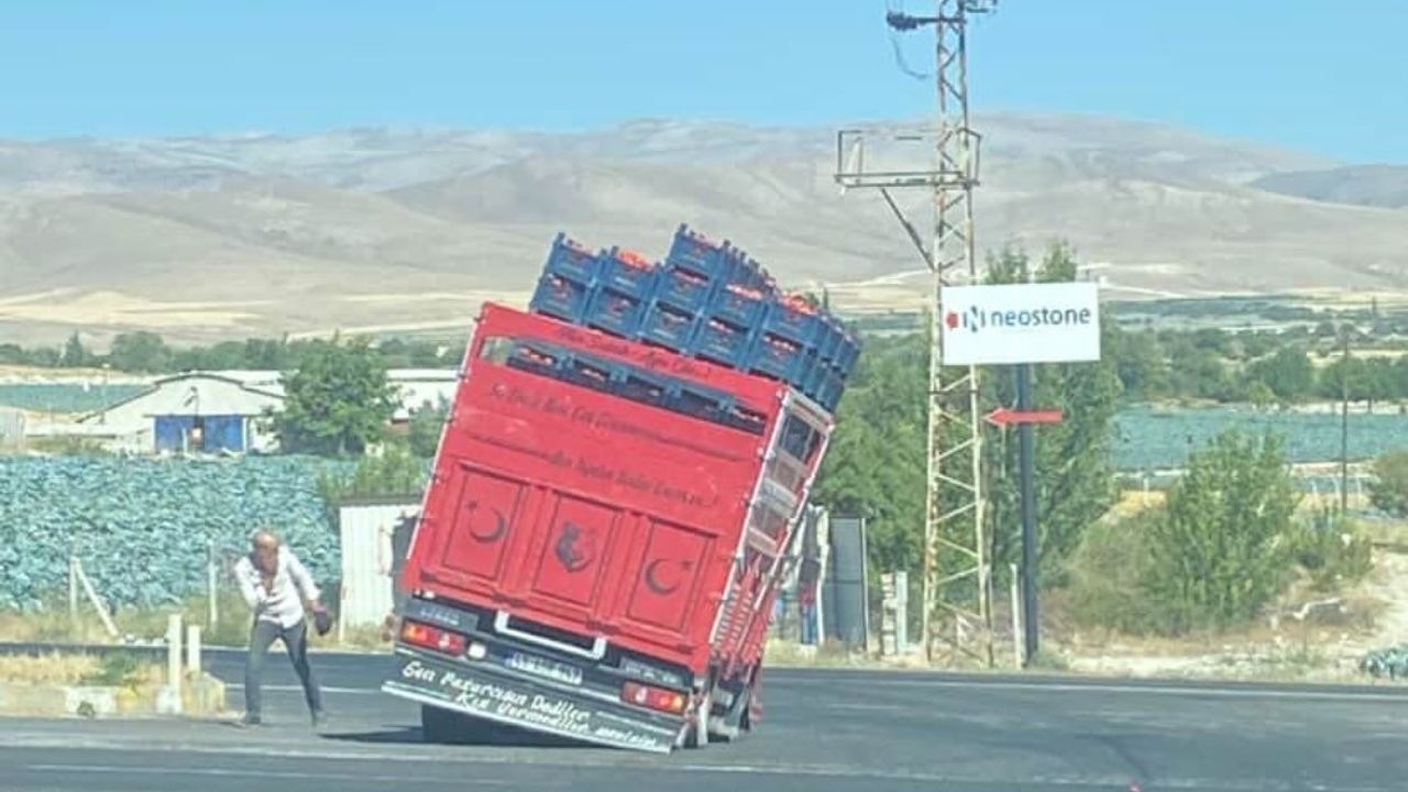 Niğde merkez Sazlıca beldesi yolunda domates yüklü bir kamyon, fazla yük nedeniyle kasasının yan yatması sonucu yolda dengesiz şekilde durdu.