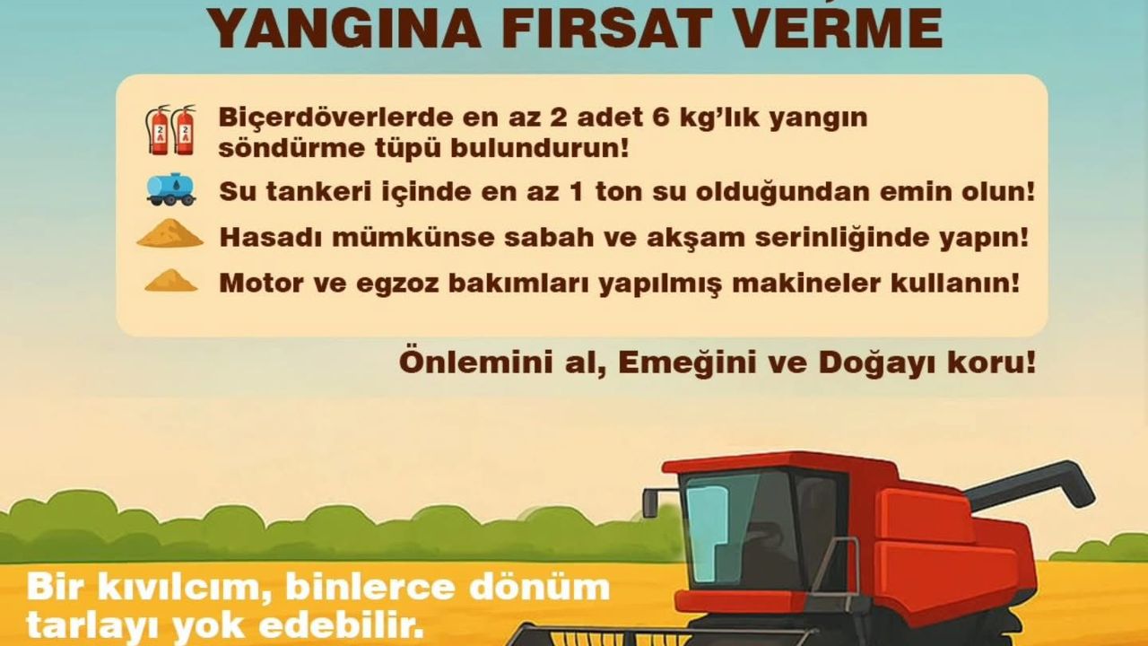 Açıklamada, hasat sezonunda biçerdöver kaynaklı çıkan kıvılcımların binlerce dönüm ekili araziyi yok edebileceğine dikkat çekilerek, çiftçilerin makinelerinin bakımını ihmal etmemeleri gerektiği vurgulandı.