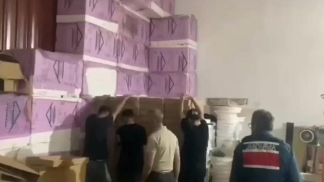 12 Ağustos saat 23.00 sıralarında H.E.’ye ait iş yerinde yapılan aramada; 1 adet Molins Mark 8d + Max 15 marka sigara basma makinesi, 2 adet Gamak marka vakum motoru, 2 adet ambalaj makinesi, 1 milyon 315 bin adet içi tütün doldurulmuş makaron, 550 bin adet sigara filtresi, 500 kilogram kıyılmış tütün, 120 adet rulo makaron üretim kâğıdı ve 90 adet rulo sigara filtre kâğıdı ele geçirildi.
