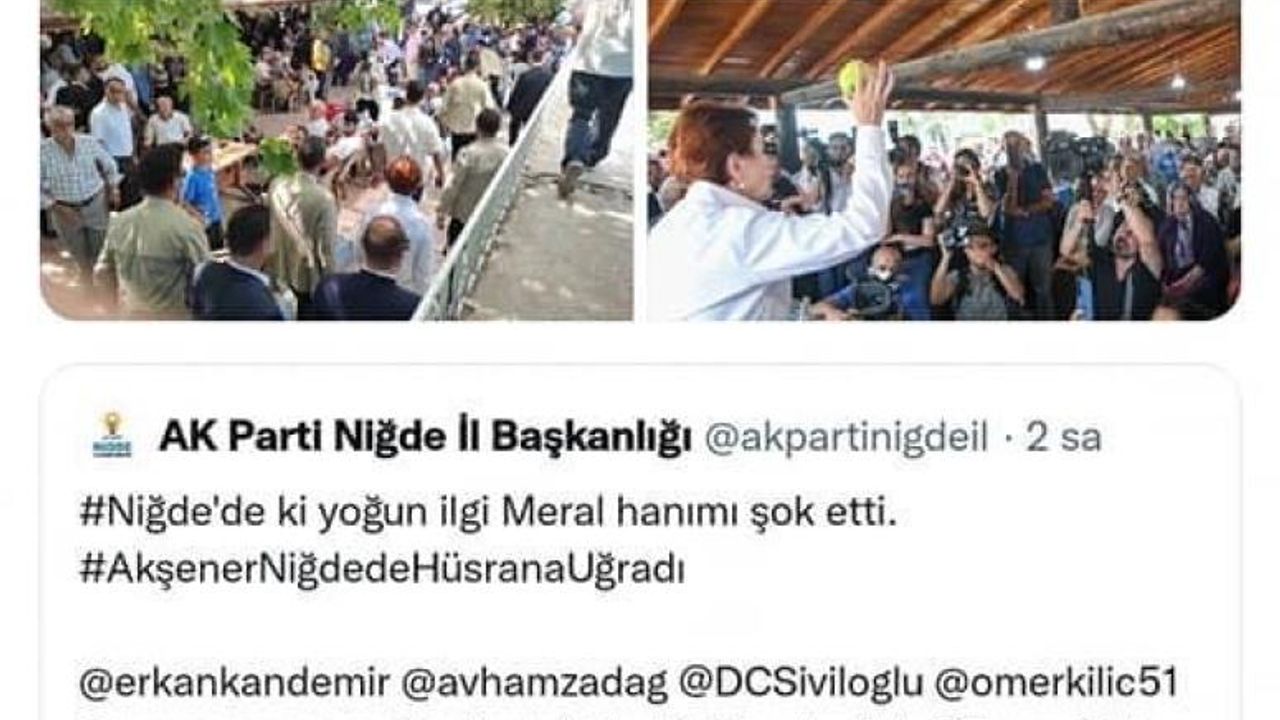 İyi Parti Genel Başkanı Meral Akşener'in Niğde merkezde az kişi tarafından karşılanmasına Ak Parti İl Başkanlığı sosyal medya hesabından 'Niğde'deki yoğun ilgi Meral Hanımı' şok etti paylaşımında bulundu..İyi Parti Niğde İl Başkanlığı ise bu paylaşıma karşılık İlçe ziyaretlerinden fotoğraf ile 'Şokunuza çok çok az kaldı&rd